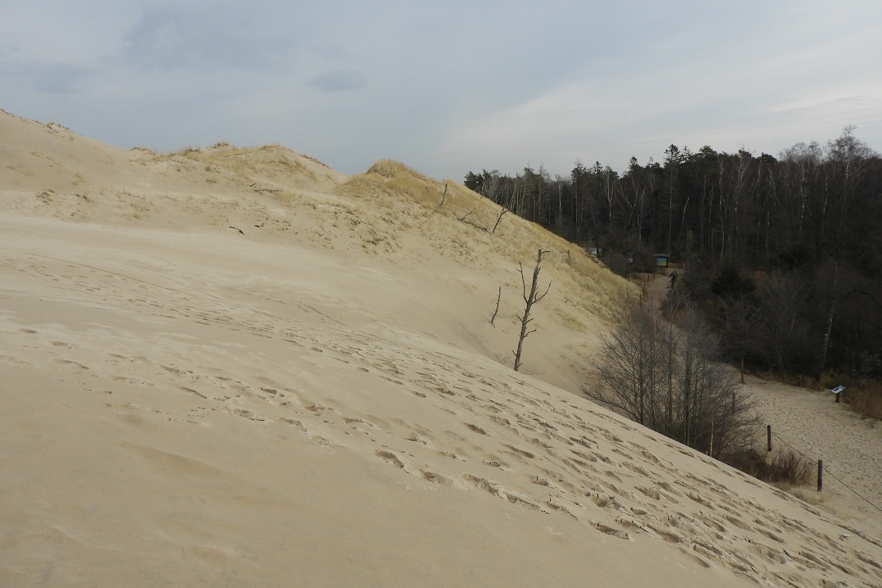 Sladkovodní jezera v příbřežních oblastech severu Polska byla převážně ještě zamrzlá, ale zaznamenat jsme zde mohli z dalších druhů orly mořské (Haliaeetus albicilla) nebo lžičáky pestré (Anas clypeata) a čírky obecné (Anas crecca). Kromě Žarnowieckého to bylo i Lebské jezero, které je součástí Slowiňského národního parku. Zde jsme si v písečných dunách šance na zajímavá pozorování ptáků nedělali. Přesto jsme pokračovali hlavně ve sledování tahu ptáků krajinou. Kromě hus nebo obligátních skřivanů jsme viděli větší hejno ostralek štíhlých (Anas acuta), ale nejvíce nás upoutal silný průtah kosů černých (Turdus merula), kteří na okraji dun využívali k zastávce nízké porosty borovic. Na samotném pobřeží Baltu v národním parku jsme už příliš zajímavostí neviděli, ale byla zase možnost v místech, kde prakticky nepotkáte žádné domorodce nebo návštěvníky, dobře užívat zdejšího mimořádného fenoménu písečných dun, které se zařezávají do podmáčeného lesního porostu na severním pobřeží Lebského jezera.