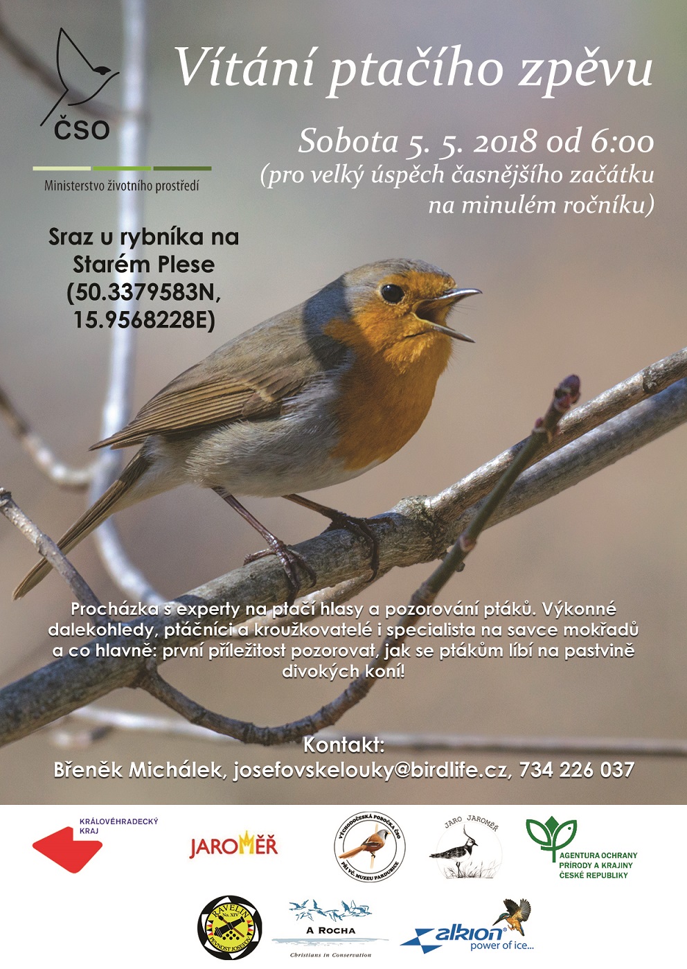 V sobotu 5. 5. 2018 od 6:00 – pro velký úspěch časnějšího začátku na minulém ročníku. Sraz u rybníka na Starém Plese (50.3379583N, 15.9568228E). Procházka s experty na ptačí hlasy a pozorování ptáků. Výkonné dalekohledy, ptáčníci a kroužkovatelé i specialista na savce mokřadů a co hlavně: první příležitost pozorovat, jak se ptákům líbí na pastvině divokých koní!