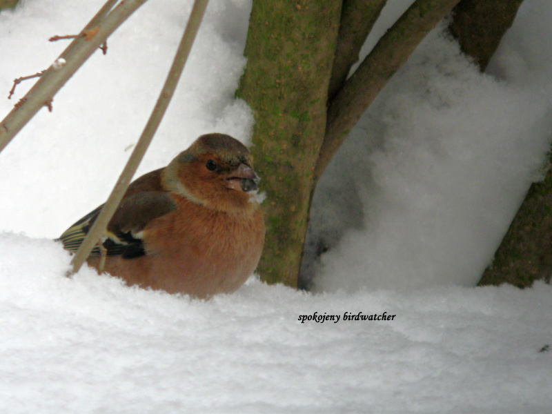 Jako každou zimu, i tu letošní jsem pro ně připravil dvě krmítka. Jedno mám na balkoně. Sem zalétají v menším počtu, ale zase tu mají větší klid. Druhé jsem jim zavěsil na kmen borovice před bytovku a tam se slétají v hojném počtu z celého okolí. Je to dáno jistě hlavně prostředím, které je tu pro ně přirozenější. Rostou zde jak nízké keře, tak i vzrostlé stromy a ptáci tím mají větší pocit bezpečí. Dřeviny jim navíc do jisté míry doplňují potravní nabídku v podobě bobulí a šišek.