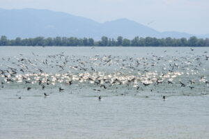 U Polykastro odbočujeme z dálnice na východ. Nacházíme zajímavou, i když vyprahlou krajinu, ale se skalnatými izolovanými výběžky, které mohou být ve zdejší krajině zajímavými stanovišti rostlin i živočichů. Příliš času už na toto zjišťování nemáme, přesto zde spatřujeme orlíka krátkoprstého, poštolku rudonohou, vlhy pestré nebo ťuhýka rudohlavého. Potřebujeme se dostat k Dojranskému jezeru, které tvoří hranici se Severní Makedonií, kde máme na pobřeží jezera v obci Stari Dojran ubytování na dvě naše poslední noci přes odjezdem domů. Důvodem jsou vysoké ceny za noclehy na řecké straně. Vlastně máme poslední celý den na poznávání severu Řecka, přičemž jako atraktivní lokalitu jsme si k tomu vybrali jezero Kerkini. Název vám může připomínat vítězné snímky z různých fotosoutěží, které zvěčňují svým osobitým a působivým způsobem zde zimující pelikány kadeřavé. Přijíždíme dopoledne do obce Kerkini, kde se nejprve zajímáme o možnost plutí po jezeře lodí. Ale zaostalá infrastruktura v přístavu, ospalí rybáři a hlavně to, že pelikány prakticky odtud nevidíme, způsobí to, že se rozhodujeme objet jižní pobřeží vlastními silami a zastavovat na příhodných místech. To se nám také osvědčuje jako nejlepší možnost, jak poznat ptactvo nejen samotného jezera, ale také lesnatého a hornatějšího pobřeží. Díky jen třem zastávkám (a dost možná i tomu, že v jezeře při absenci vody jsou mělčiny v pobřeží) vidíme například volavku vlasatou, ibise hnědého, orlíka krátkoprstého, orla nejmenšího, luňáky hnědé, ťuhýka rudohlavého nebo strnada cvrčivého. Při posledním zastavení spatřujeme přesuny tisíců kormoránů velkých a asi 400 až 500 pelikánů k východní části jezera. To musí něco znamenat. Máme velké štěstí, že si hejna kormoránů velkých v doprovodu pelikánů jak bílých, tak kadeřavých (kterých je ale podstatně méně), vybírá loviště ryb prakticky přímo před námi nedaleko břehu. Zůstáváme oněmělí úžasem nad přírodním divadlem, které dosud nikdo z nás neviděl. Po ukázce společného ptačího lovu ryb se zaměřujeme na kolpíky bílé, volavky stříbřité a mezi racky a rybáky objevujeme na břehu sedící i dva rybáky severní. Začíná bouřit a my se za vlastně prvních kapek deště na naší cestě zastavujeme v místní restauraci na hrázi této uměle vybudované vodní plochy. Čekání na jídlo nám zpříjemňuje pozorování sedmihláska šedého a krátce i krahujce krátkoprstého. Program díky již docela vytrvalému dešti na zbytek dne musíme omezit na návrat do ubytování, kde nás ale večer zaujmou zajímavé hlasy. Přímo u našeho apartmánu Slavica zjišťujeme, že jejich původci jsou nejméně tři sýčkové obecní. Usedají na vrcholky okolních stromů a dokonce i sloupů. Jsme tak od sýčků jen pár metrů, navíc prakticky (díky tomu, že bydlíme v prvním patře) na naší úrovni.